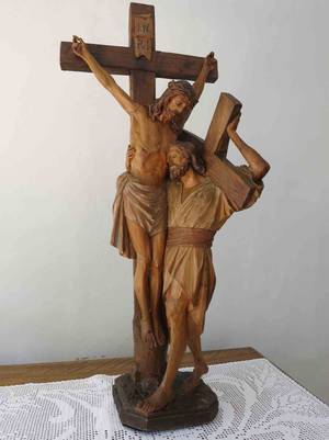 Dieser kreuztragende Mensch umfasst mit dem rechten Arm das Kreuz und den Körper Jesu und heftet sich mit der Hand an Jesu Körper. Mit dem linken Arm und der Hand stützt er sein eigenes Kreuz. Das geneigte Haupt Jesu zum Menschen hin und das ergebene Gesicht des Menschen, das er an die Seite des Herzens von Jesu Köper lehnt, drücken Liebe und Vertrautheit aus. Es ist wie ein gemeinsames Kommunizieren. Dadurch schmelzen sowohl die Personen wie die beiden Kreuze zu einer Einheit, die - trotz Kreuz - Geborgenheit ausstrahlt.